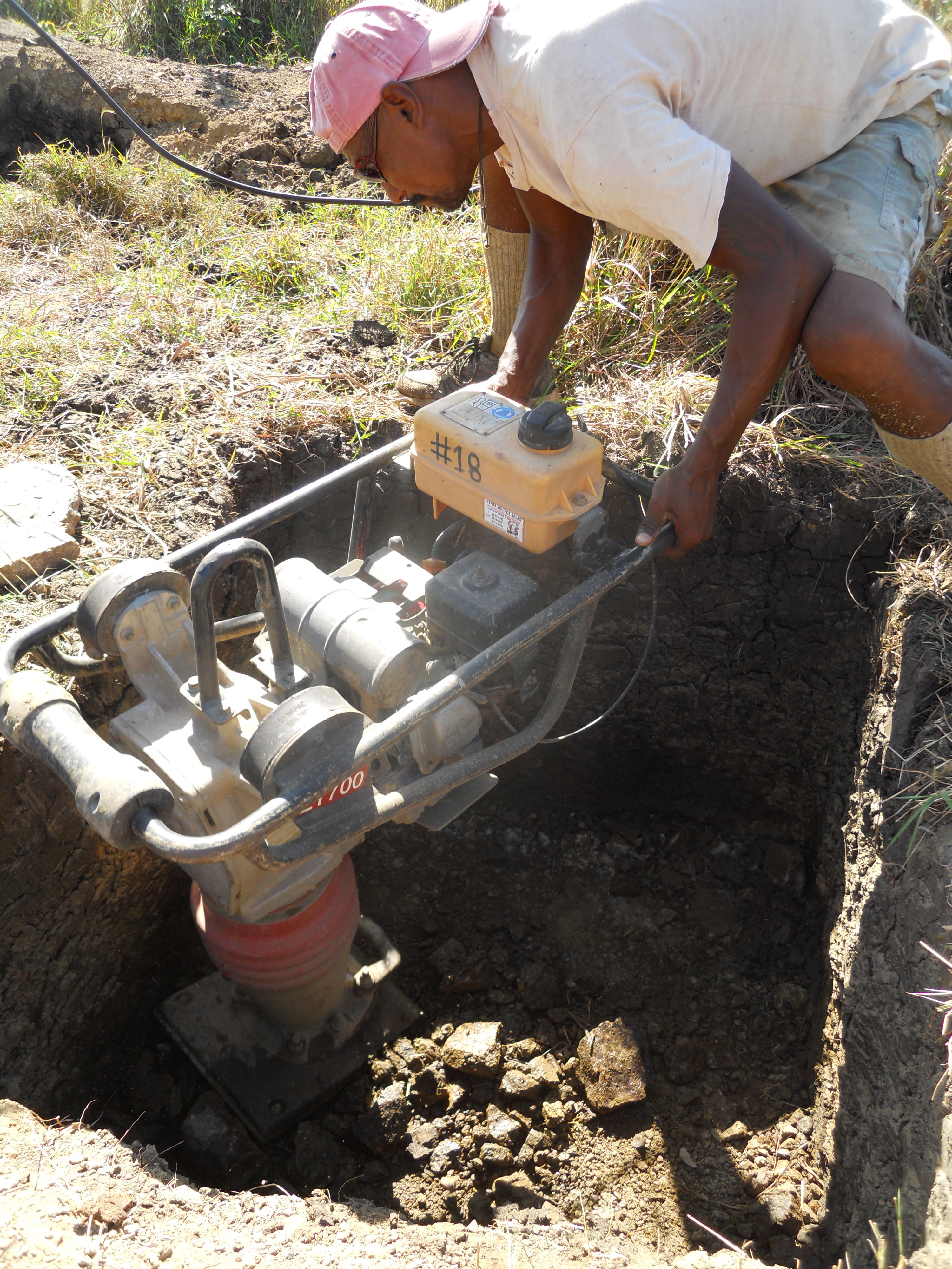 First, Jesus and I dug the foundations for four 1-meter square holes to support the 4 pillars. Next, we filled them partially with gravel and Jesus compacted them thoroughly.