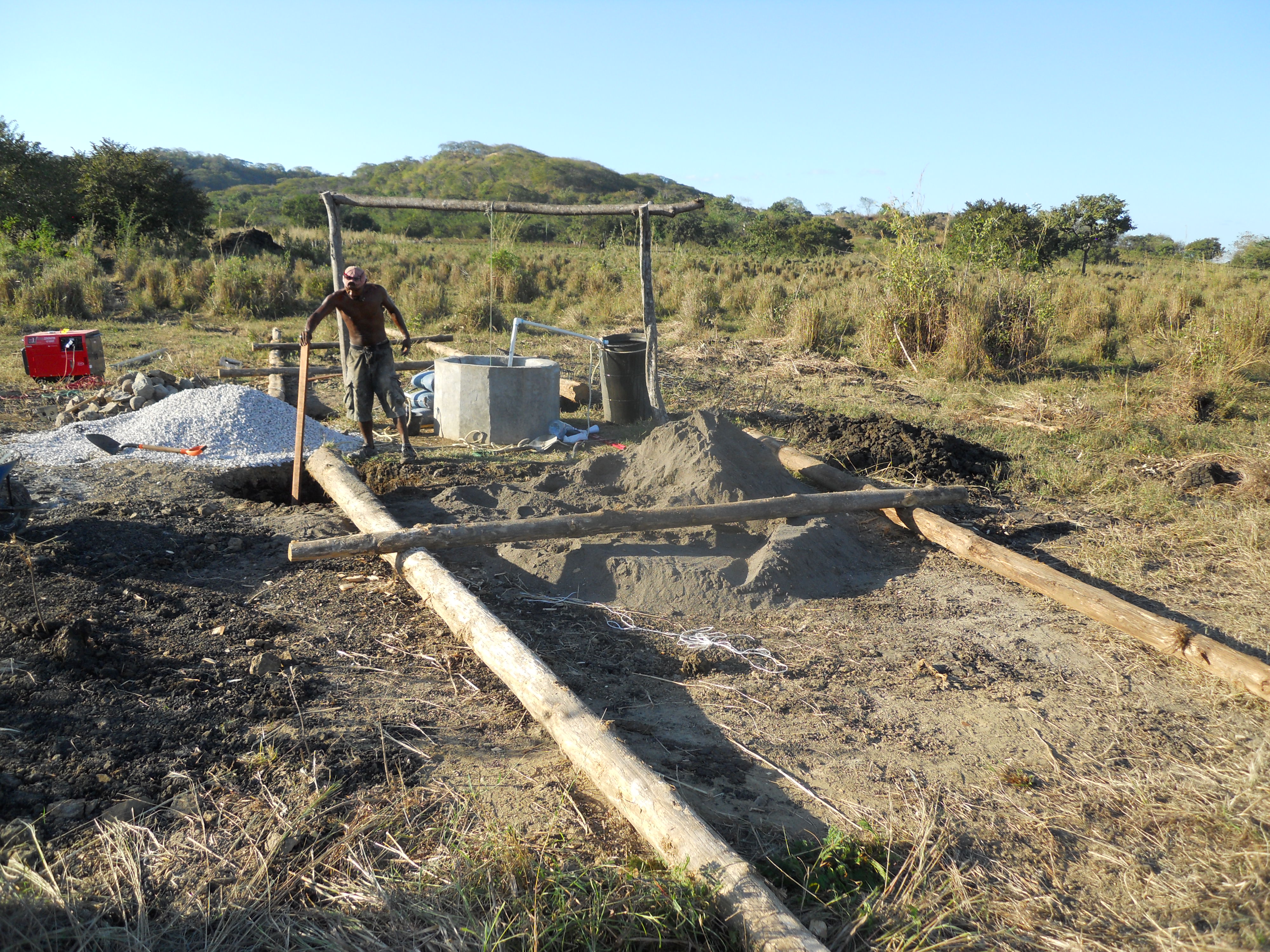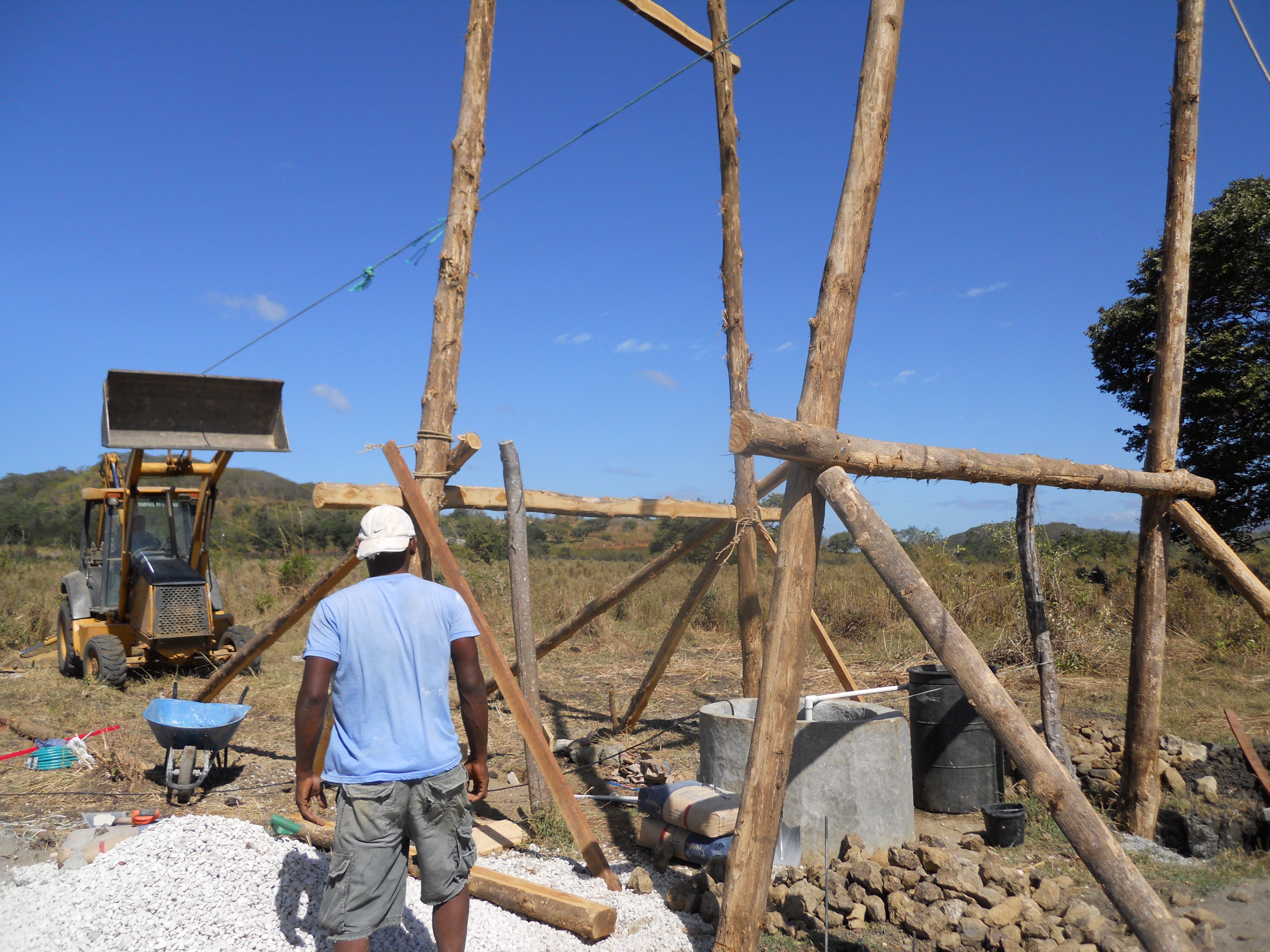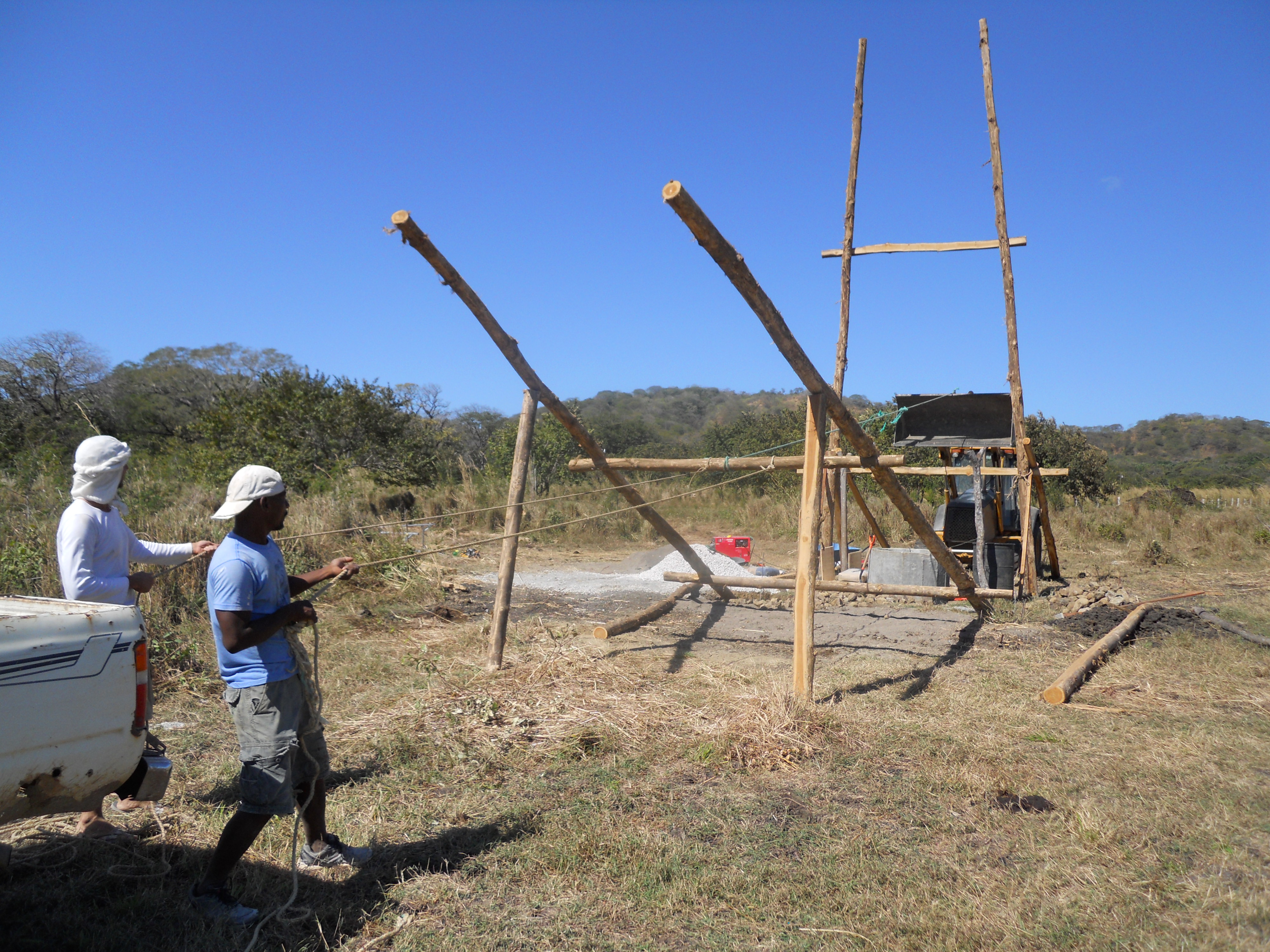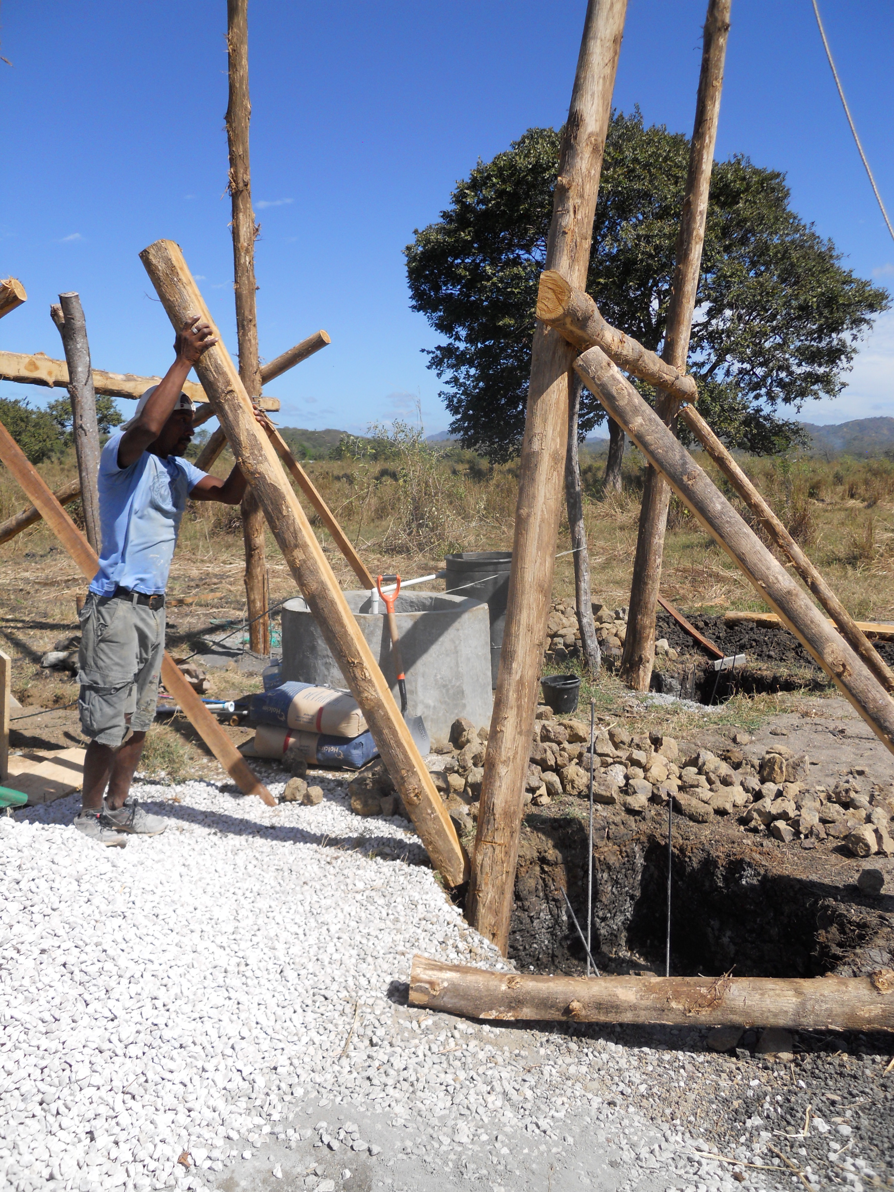 Since the four posts lean inwards, one of the trickiest and riskiest parts was preventing the second pair of teak posts from falling against the first set once the backhoe lifted it into a vertical position. To do this, Yannai and Jesus (on the opposite side of the well as the backhoe) acted as a temporary counterweight until I was able to use the pickup truck (stationed behind them) to slowly tilt the poles into the right position. This photo reminds me of some depiction of ancient Egyptians raising obelisks.