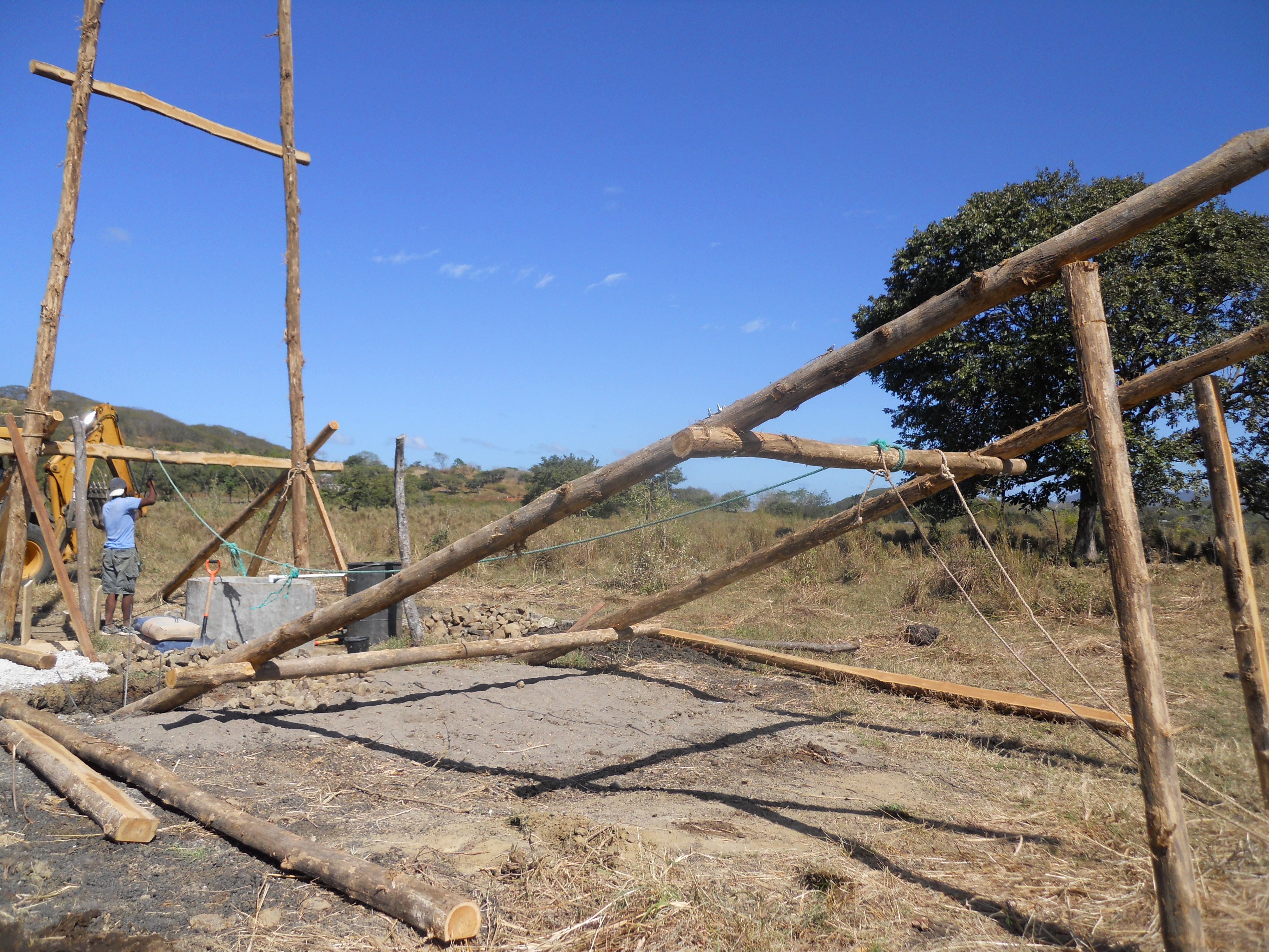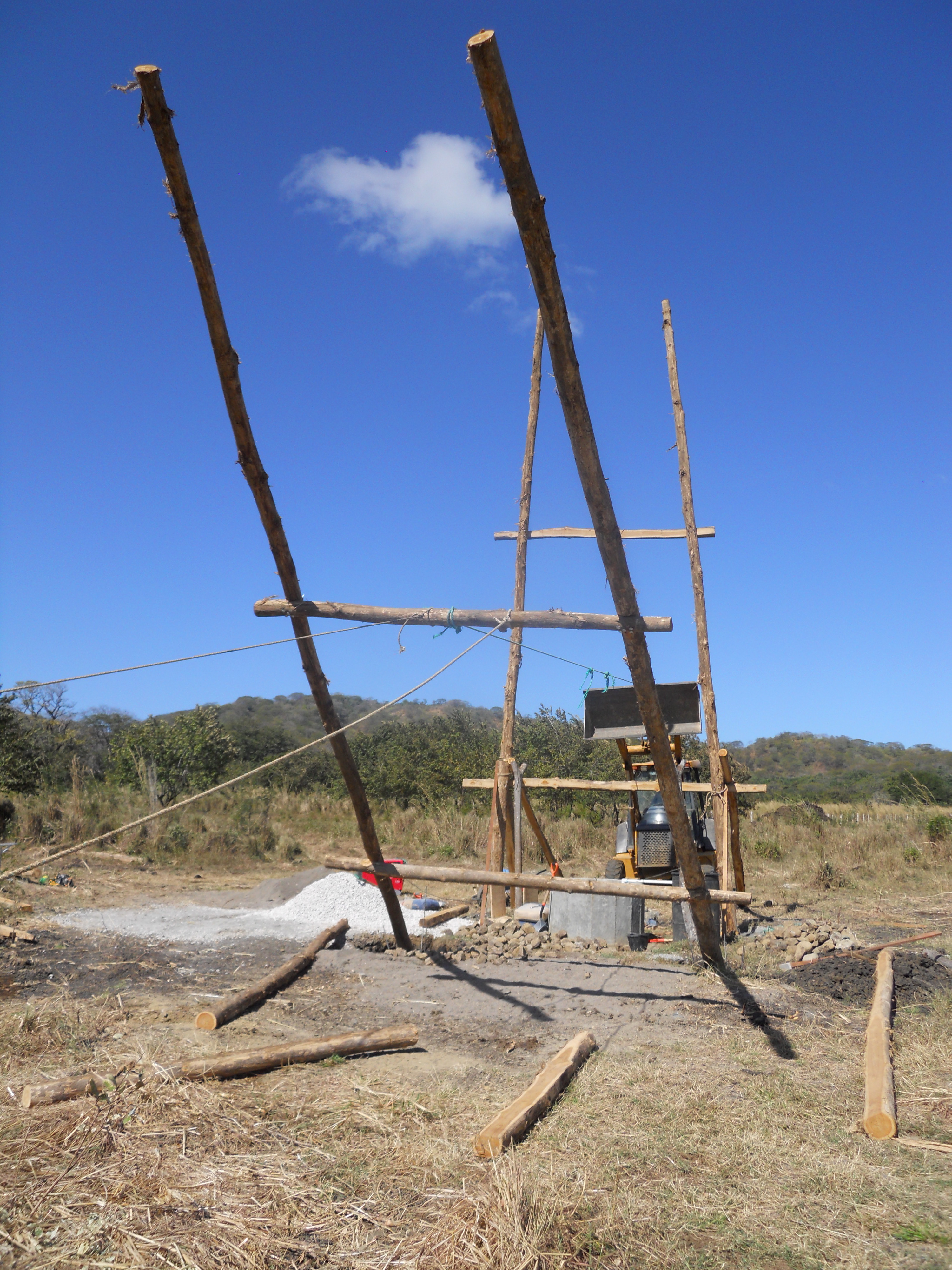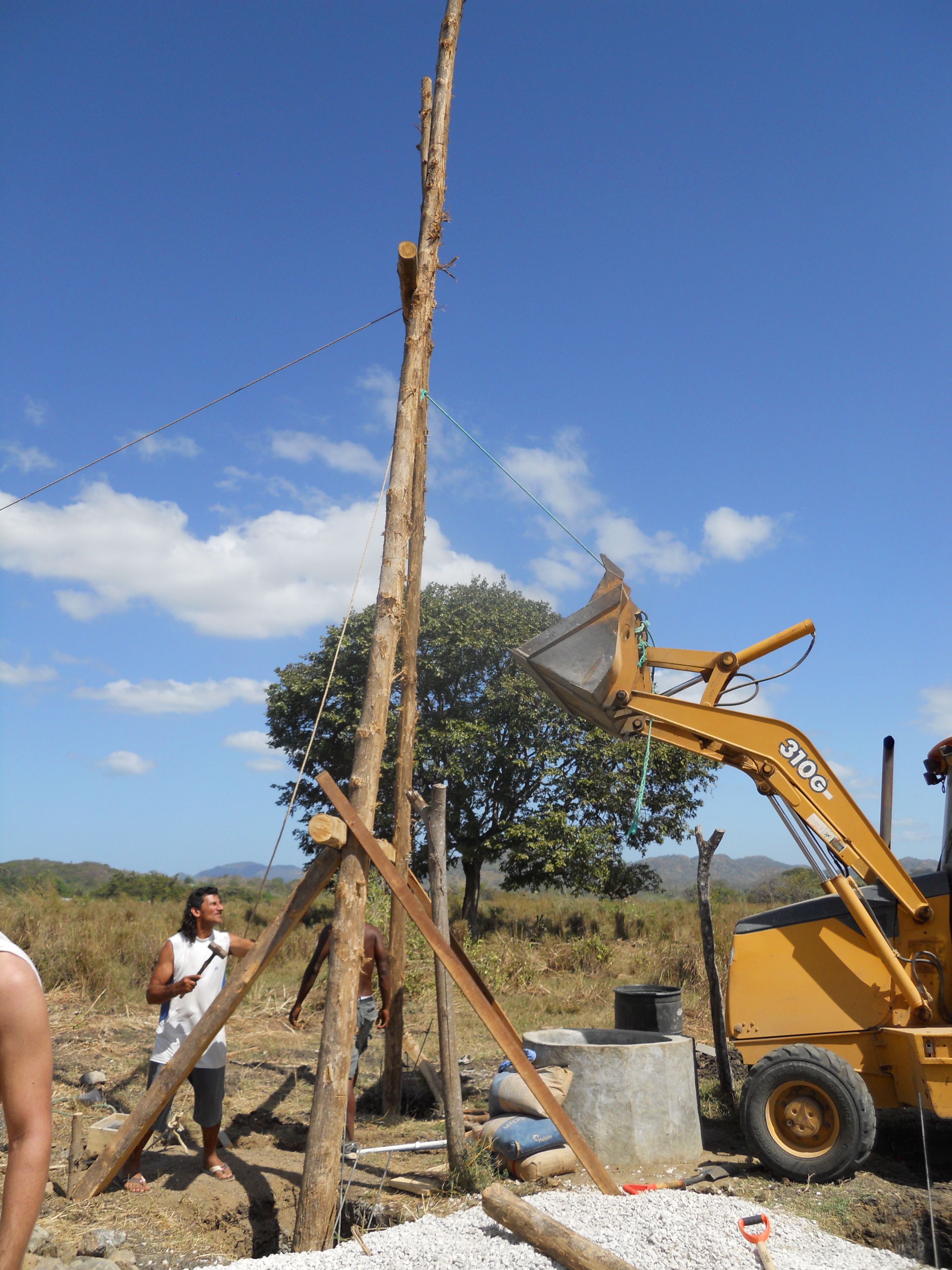 The backhoe lifted each pair of bolted poles in two phases. First, with the bucket, which gave us a chance to temporarily brace them in the position shown above, with the base of the poles now inside the foundation holes. Once the poles were propped up, we repositioned the backhoe on the other side of the well so it could pull the teak poles the rest of the way up using rope.
