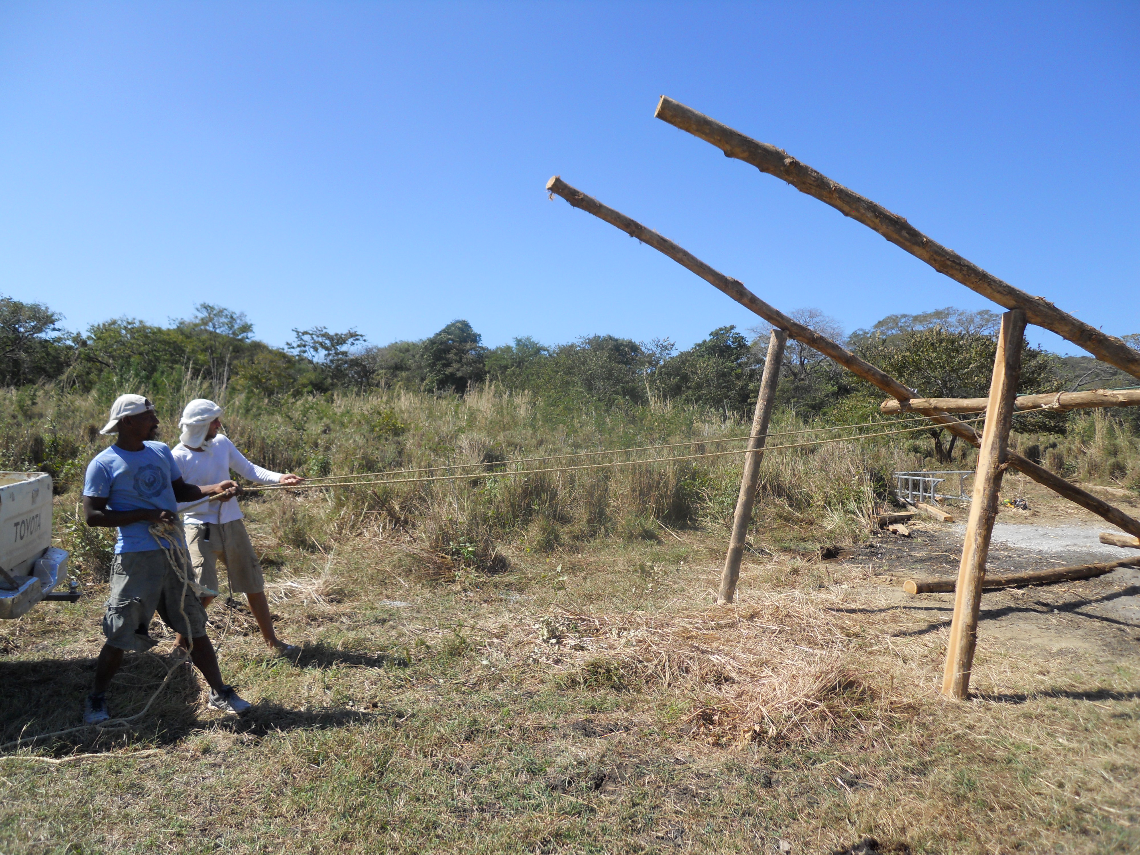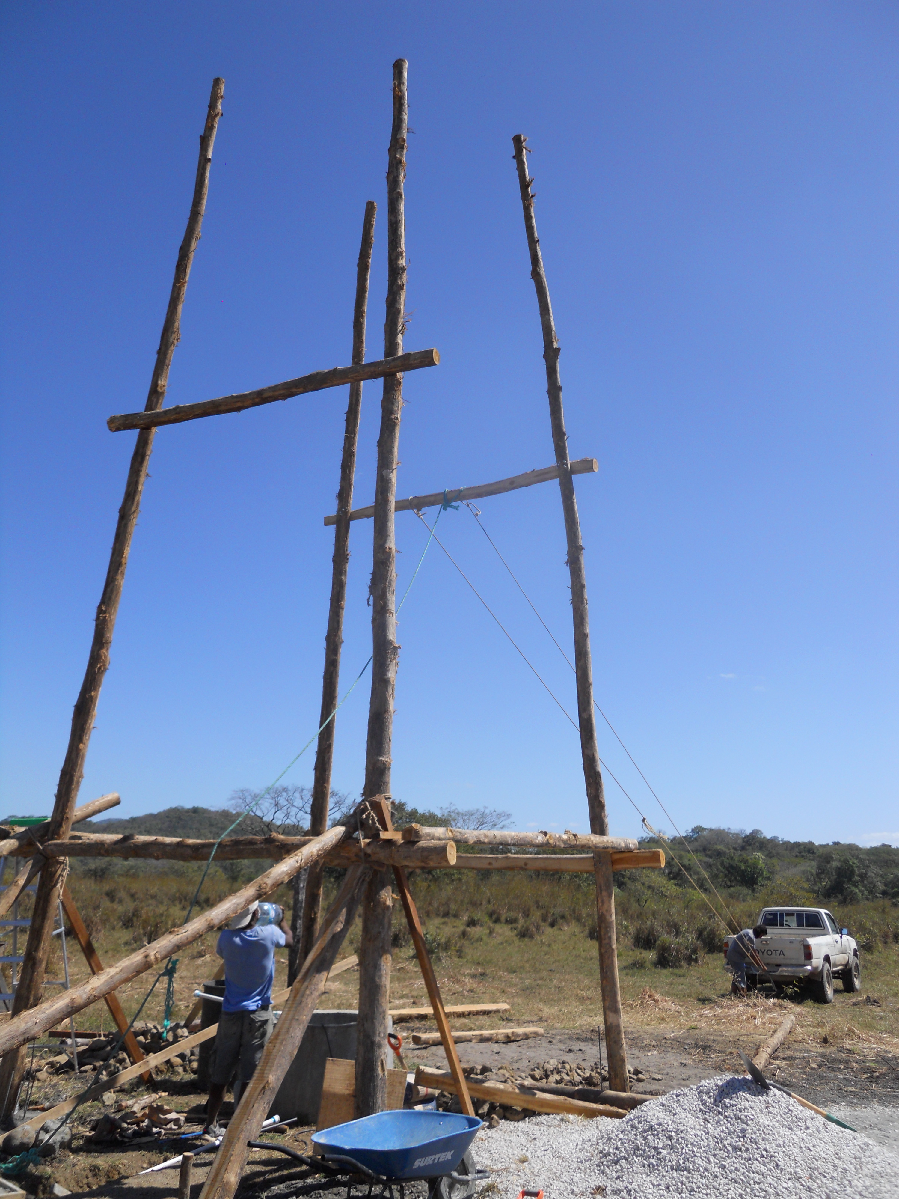 The pickup truck supported the poles at just the right angle, until they were fastened into place with two more horizontal teak poles and the two remaining foundation holes filled with concrete. At this point, the hardest part was now done so the rope is being removed from the pickup.