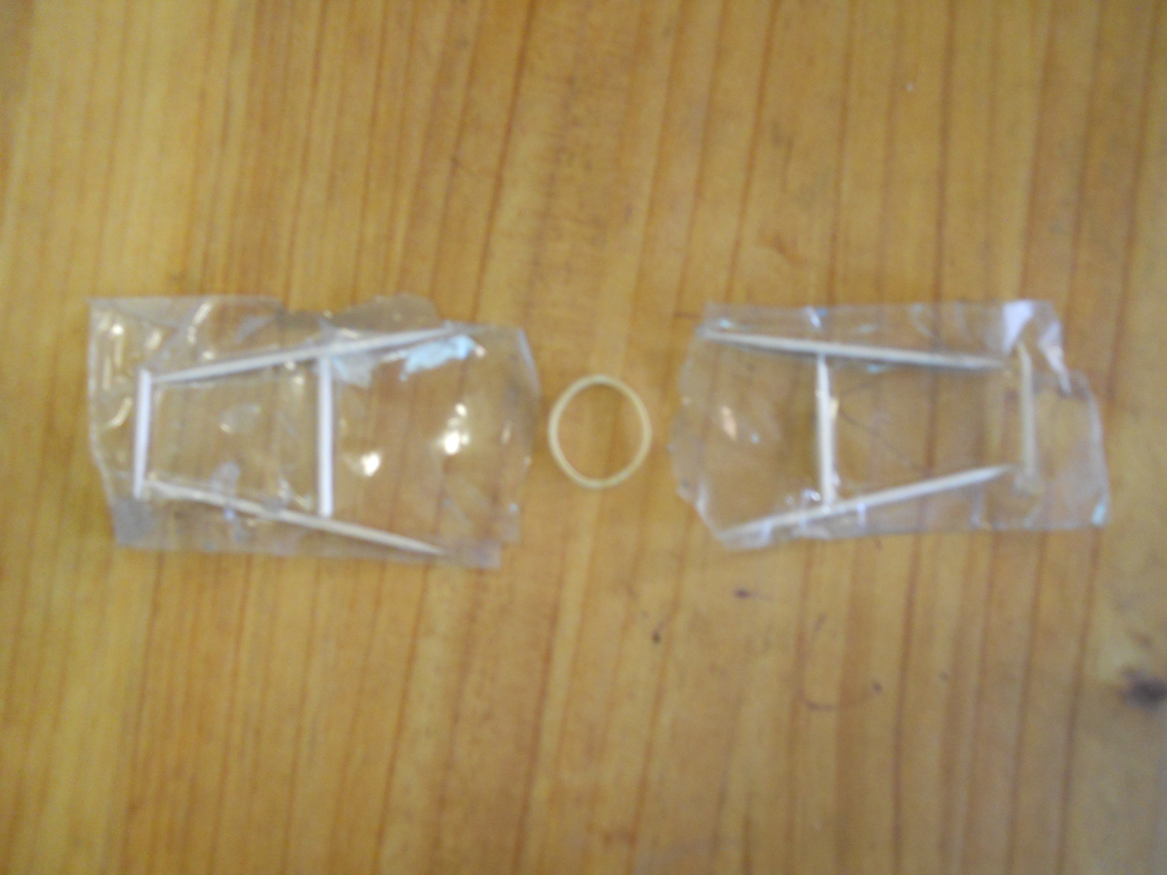 Like my model, here are the two sets of giant teak toothpicks positioned on each side of the well, with their butts positioned over the foundation holes so they drop inside while being lifted. Unlike my model, I fastened them with nuts and bolts rather than scotch tape.