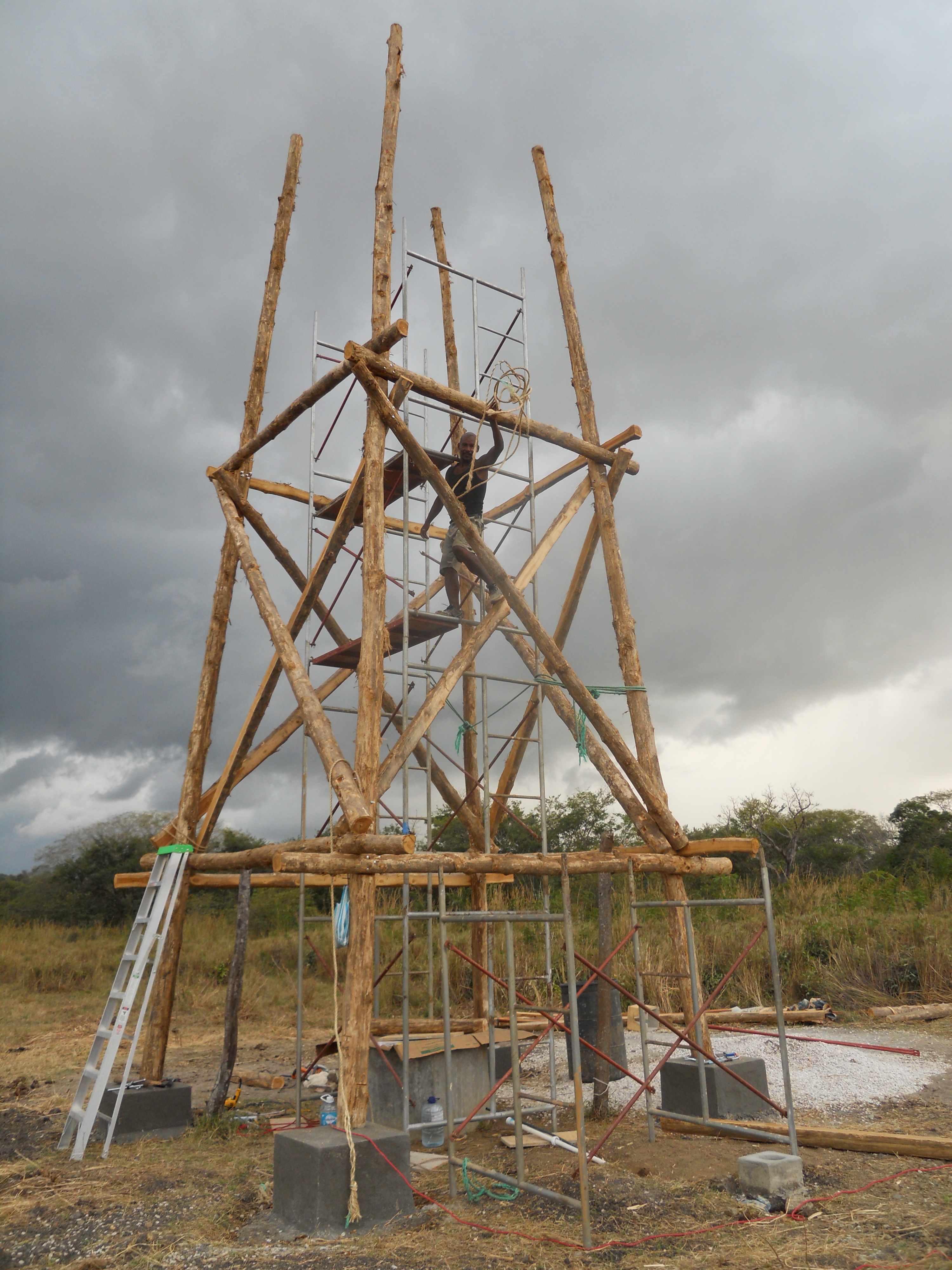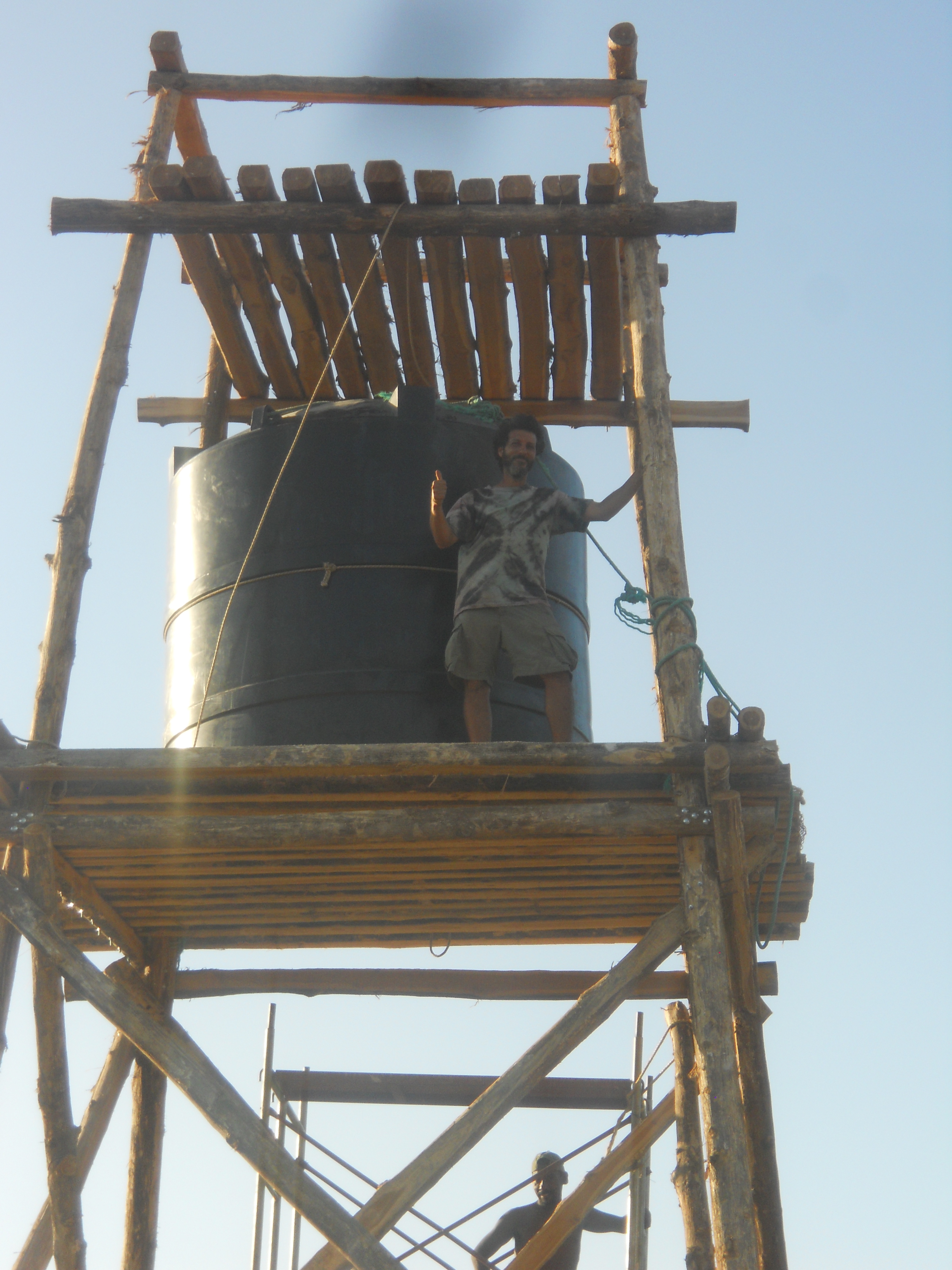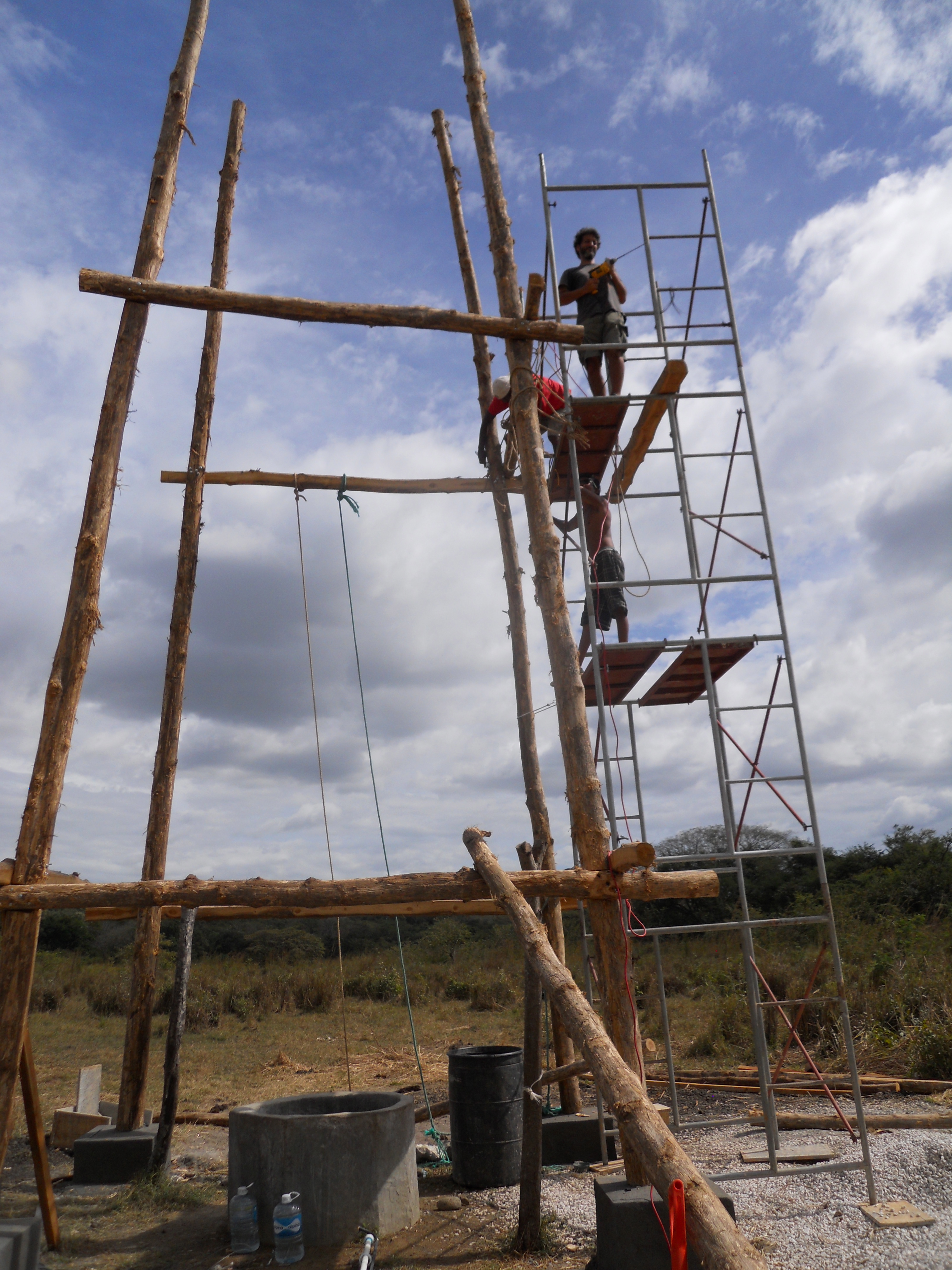 Once we had our well dug, we began constructing a 9-meter/30-foot high water tower using locally harvested teak poles to get some gravity-fed water. This turned out to be fairly challenging because each of those four upright 10-meter teak poles weigh a ton and the only cranes we had access to were birds and they didn’t help at all.