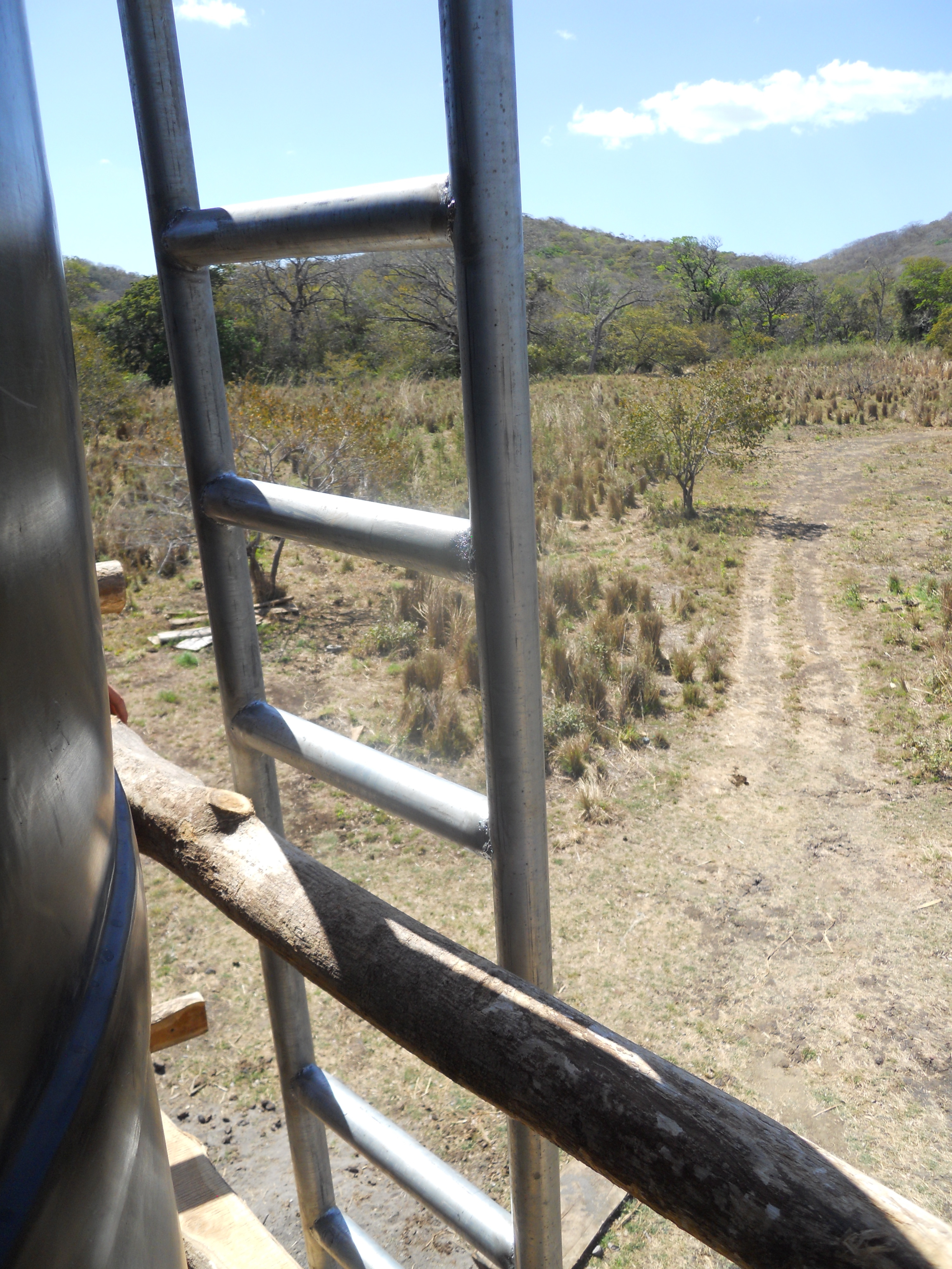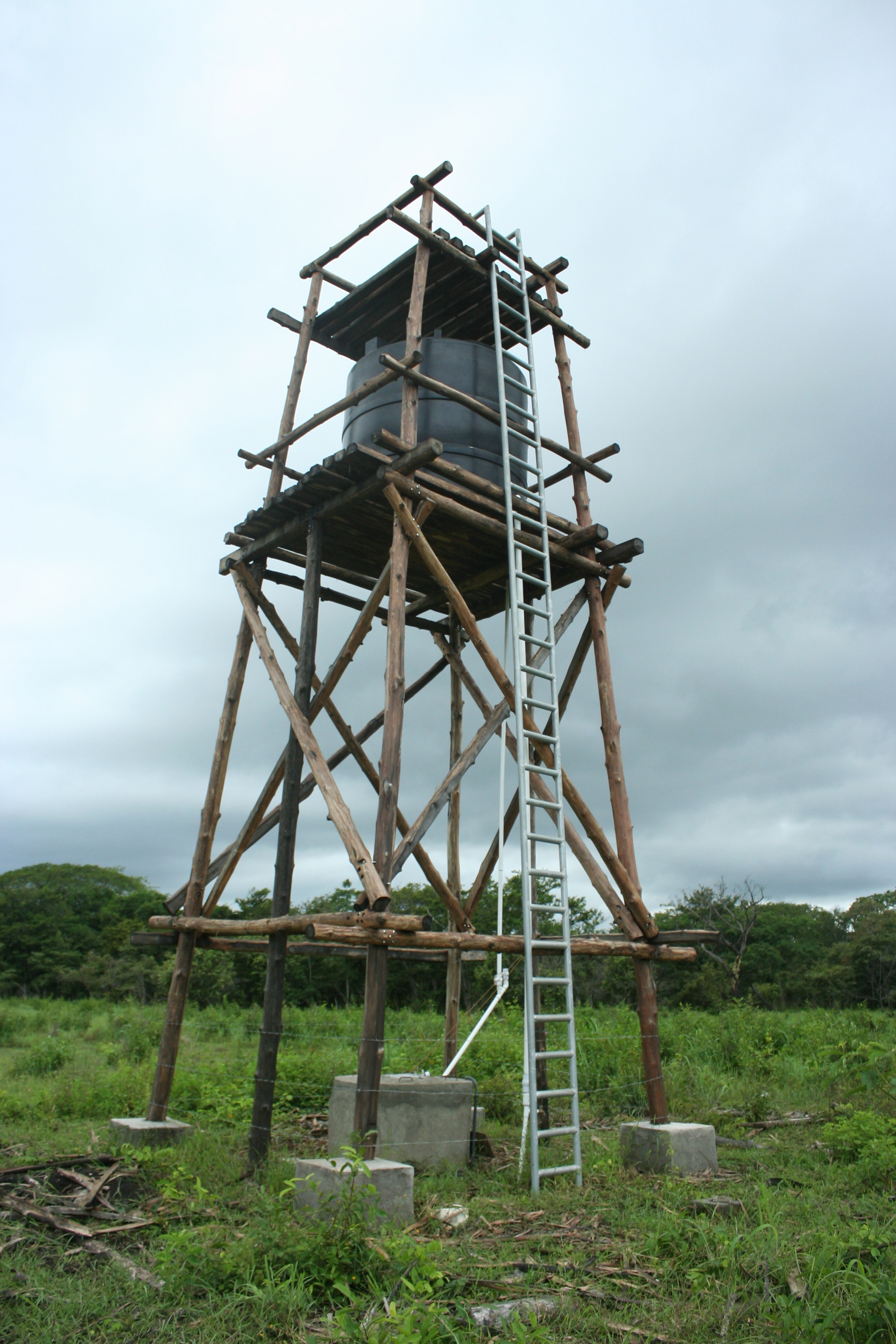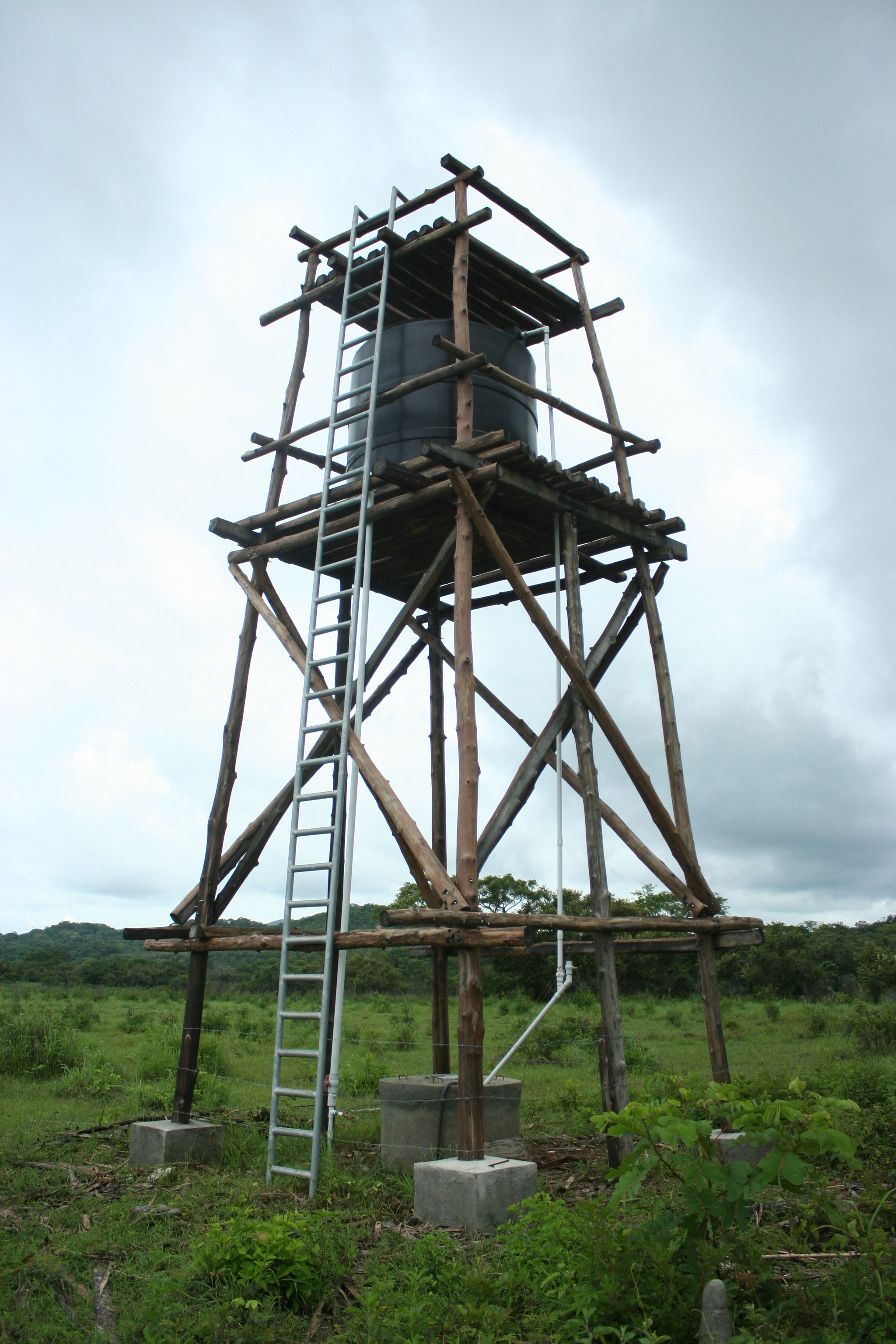 Once we had our well dug, we began constructing a 9-meter/30-foot high water tower using locally harvested teak poles to get some gravity-fed water. This turned out to be fairly challenging because each of those four upright 10-meter teak poles weigh a ton and the only cranes we had access to were birds and they didn’t help at all.