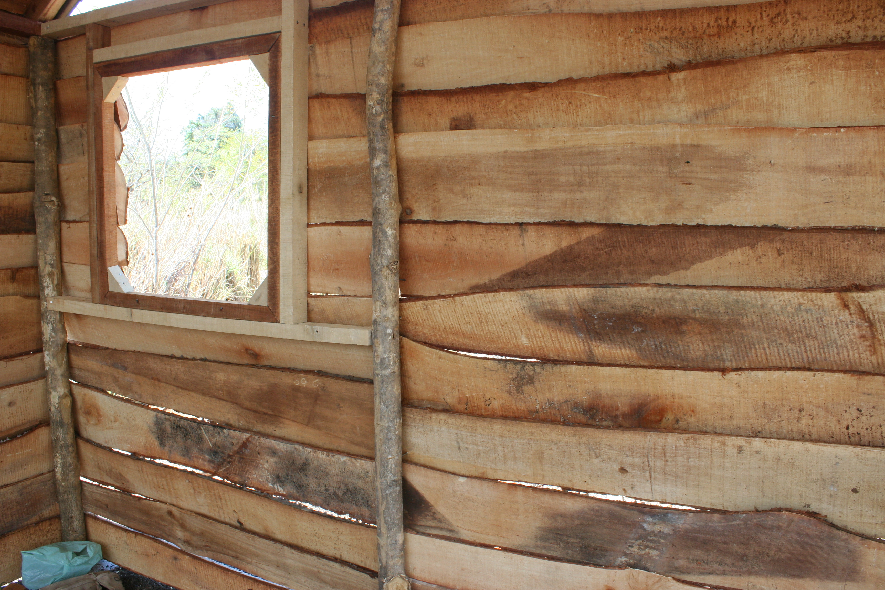 Once the window and door frames were installed (using standard 2×4 lumber), we laid out all the wood on the ground to help us figure out the most appropriate pieces to use, in the best order, for each segment of the shed. Then, starting at the bottom, we carefully overlapped each piece and nailed them on with long nails.